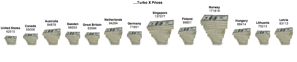 Those Turbo X prices include taxes so they are useless for cost price comparisons between countries. Does the price for the US include state sales tax?