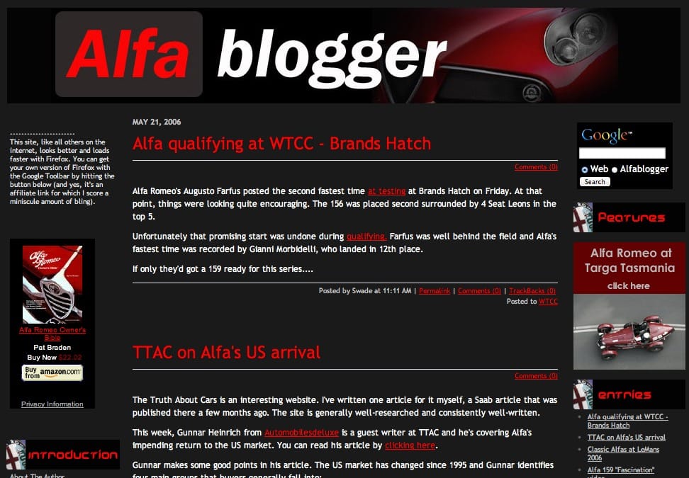 My first Saab blog gained traction pretty quickly so in 2006, I was interested in replicating that success with a site about my next favourite brand – Alfa Romeo. I started a site called Alfablogger and it, too, gained a reasonable audience in a short period of time.