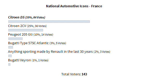 The number of votes was a little underwhelming, but the result is now beyond dispute. The Citroen DS is considered the most iconic French automobile by some of the wisest automotive enthusiasts in the galaxy – YOU!