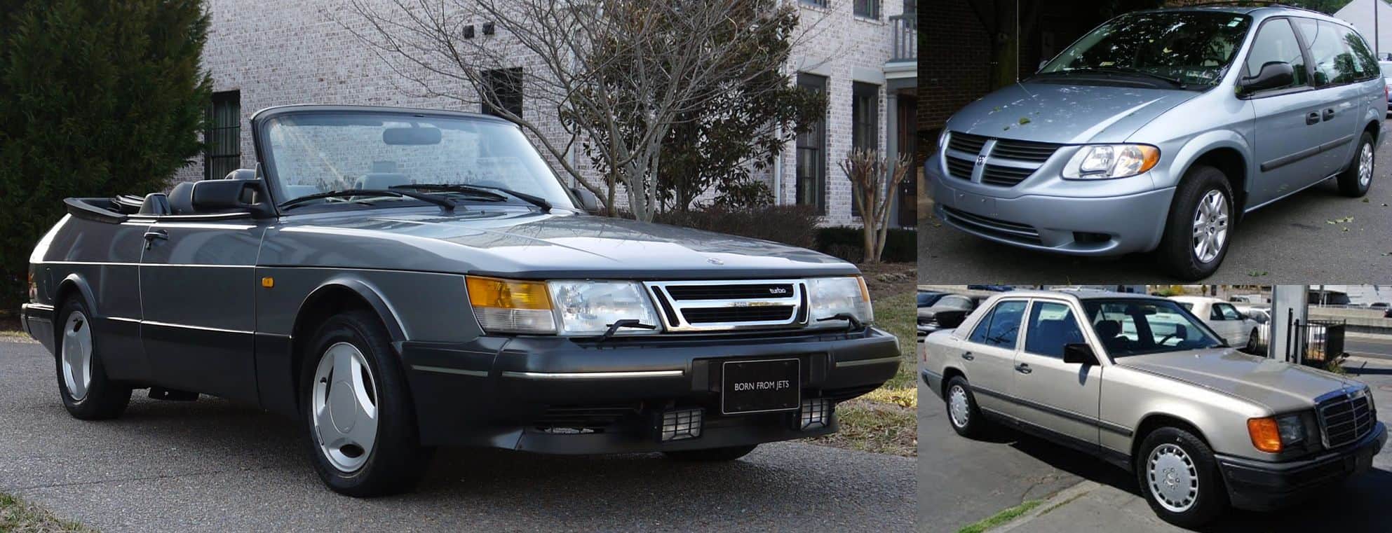 So, 1991 Saab 900 SE Convertible, completely STOCK, even down to the stereo. Redbox EPC, etc. My wife’s craptastic 2006 Dodge Grand Caravan 3.3l automatic and I’m driving my dad’s 1992 300D 2.5l turbodiesel with a 3-speed + overdrive slushbox.as a daily driver. The Merc is bullet proof, but slow. It has some serious paint issues which don’t show in the photo. The van photo is an internet match; mine looks identical, but who wants to take time to photo a minivan? On the plus side, the Stow-n-Go seating is excellently executed.