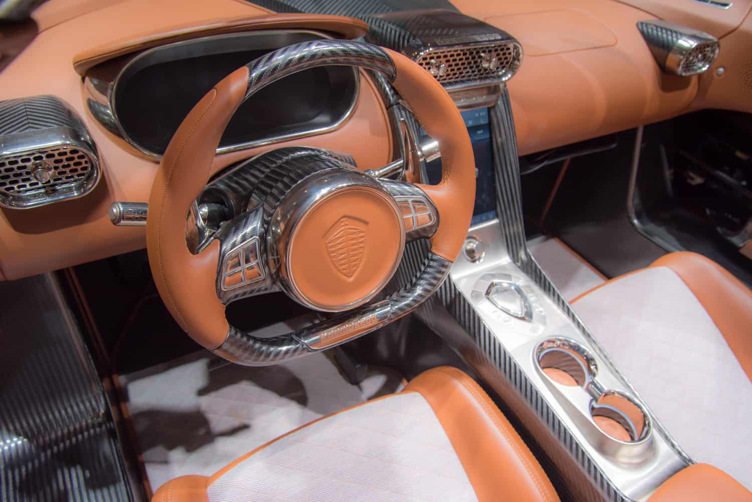The interior of the Agera ML – named using the owner’s initials – features yellow piping on the seats and black buttons on the control centre. Christian even autographed the carbon dashboard with a gold pen.