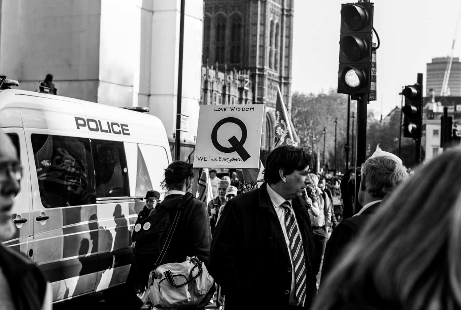 One of a few Q-Anon signs seen