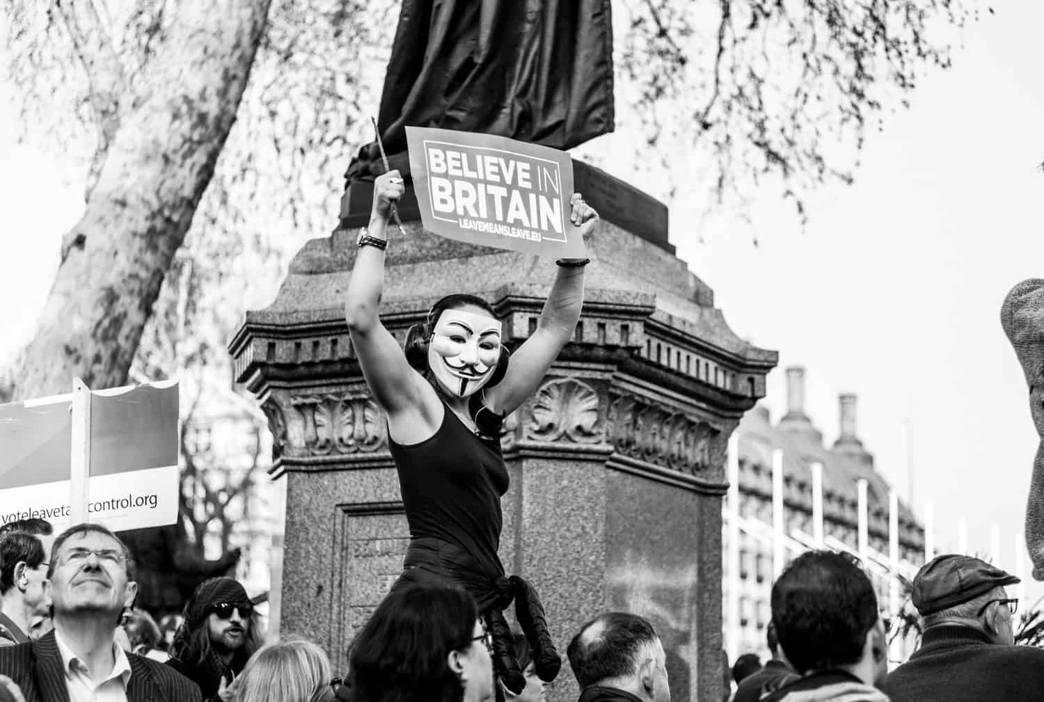 The obligatory Guy Fawkes mask at the March to Leave rally.