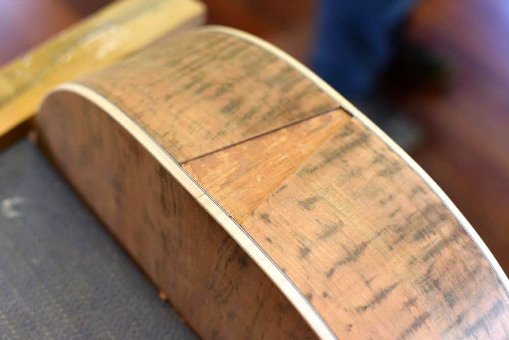 What you see in that photo is the top (spruce), back and sides (tiger myrtle) as well as the neck (mahogany) and fingerboard of the guitar. Plus the tuners in the box. We also used a few strips of King Billy Pine used for the bracing, and some leatherwood used for kerfing. The parts that you can’t see there are the bridge, bridge pins, nut, saddle and fretwire. All of those are supplied.